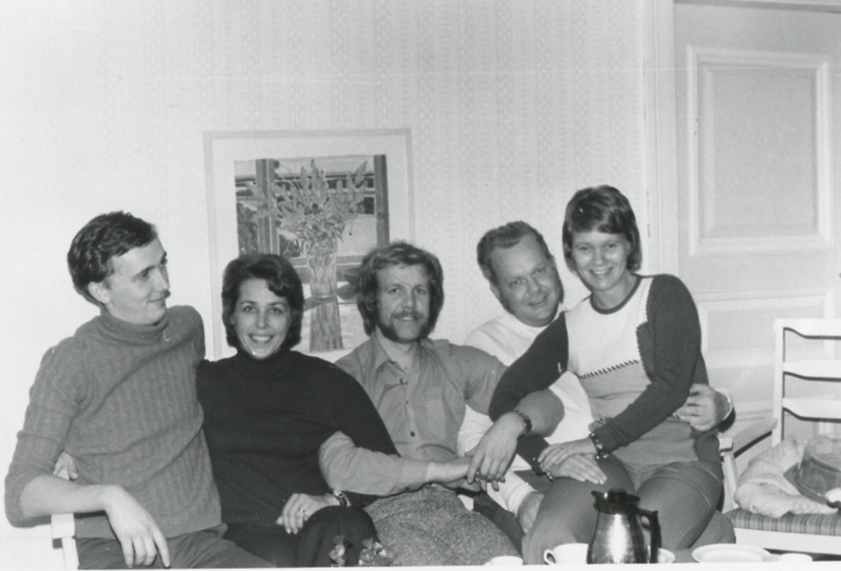 Medföljande vuxna vid Brattåsskolan åk 6 elevers lägerskola, Ransbergs Herrgård i Värmland 1975. Från vänster: 1. Okänd man. 2. Else Britt Nilsson, förälder. 3. Tomas Bergström, lärare. 4. Okänd man. 5. Berit Brännström, förälder.
