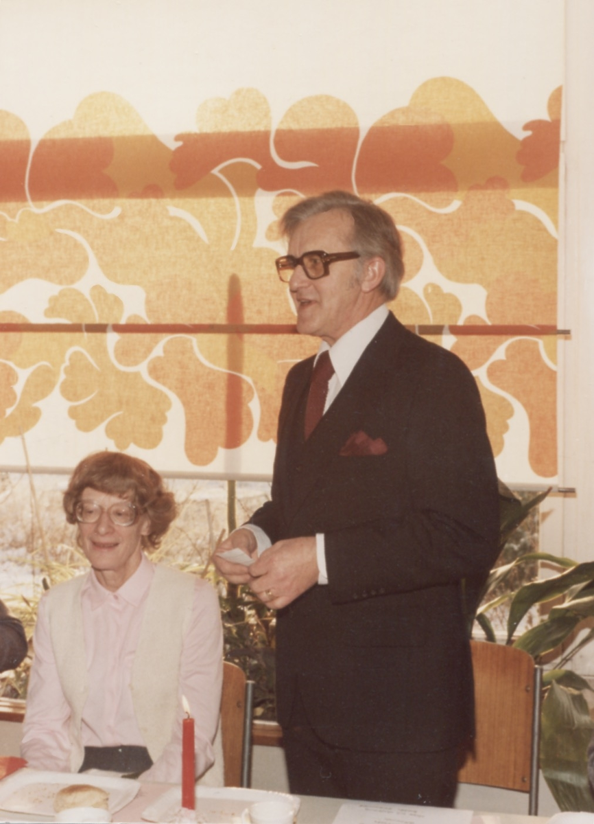 Rektor Gunnar Hillerström avtackar Eugenia "Wendy" Lundström (född 1917 i Storbritannien, död 1988 i Mölndal) inför hennes pension, Brattåsskolans matsal cirka 1984. Hon bodde i Bölet och arbetade som skolmåltidssbiträde från 1962-1984.