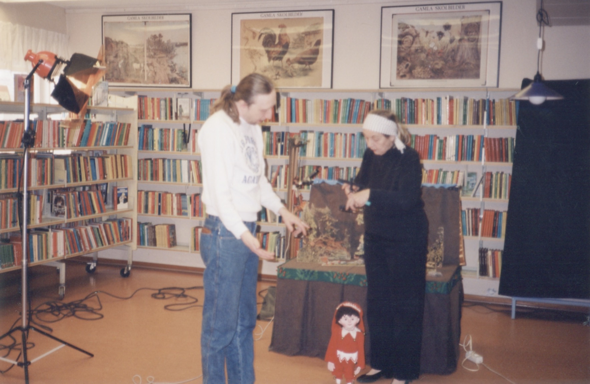 Dockteater-föreställning med Blanka Kaplan, som visades under Barnkulturveckan år 1997. Anordnad av SV (Studieförbundet Vuxenskolan) på Kållereds bibliotek. Fotografen Lars Andersson, som video-filmade föreställningen, står bredvid Kaplan. I bakgrunden ses böcker i bokhyllor. Relaterade motiv: A4527 - A4530.