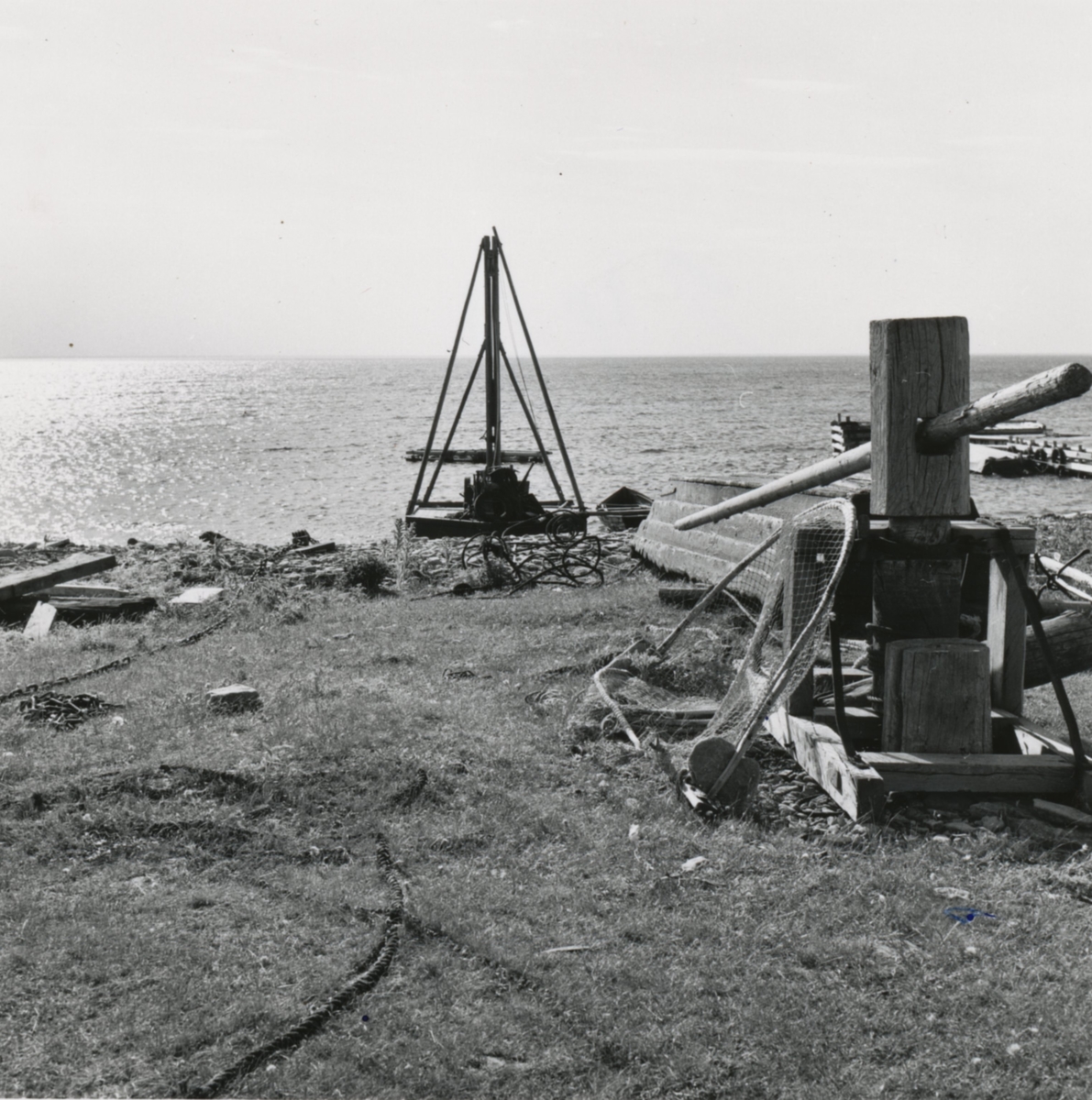 Spel och ryssja i förgrunden, samt en pråm och bryggor.