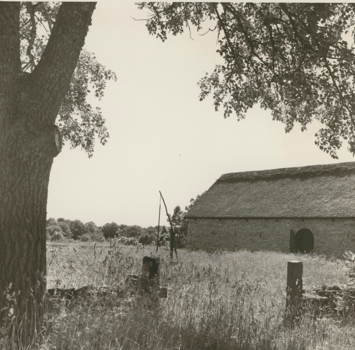Ladugården öster om kyrkan. Brunnen med vipp.