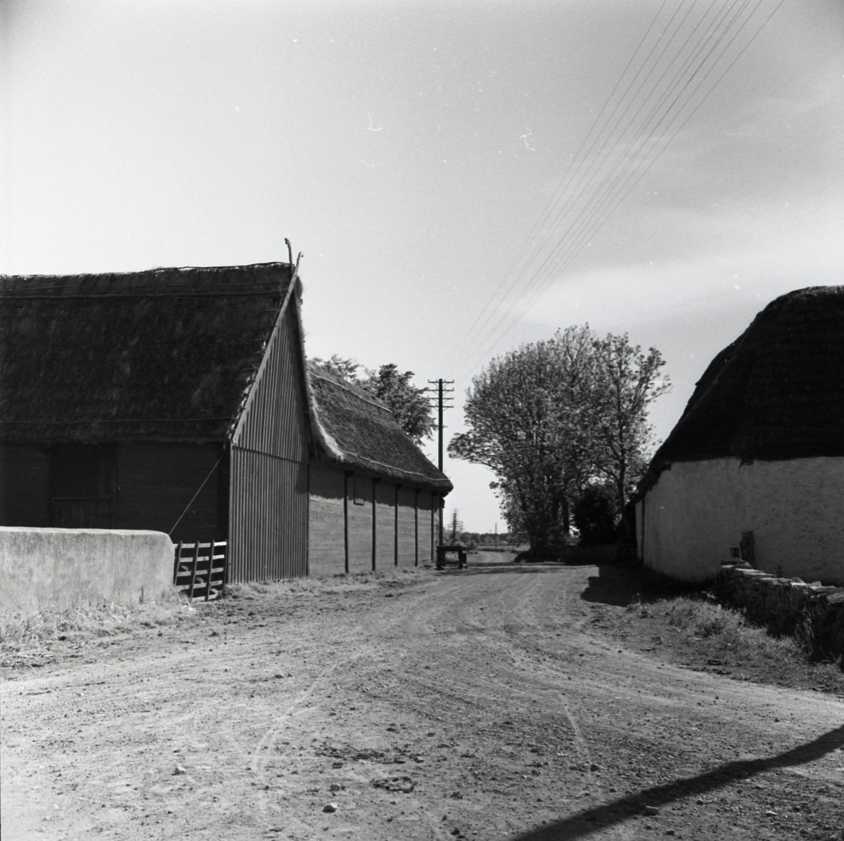 Tvärgata med ladugårdslängor. Döstak med takprydnad.