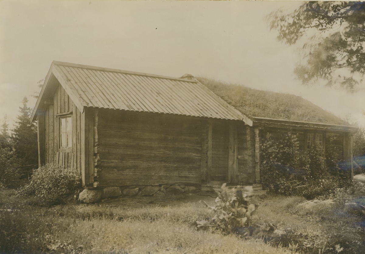 Timrad stuga med korsknut och torvtak i Fagerhult.