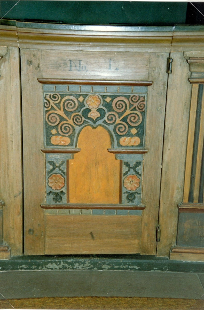 Dörr med målad dekor till kyrkbänk i Mortorps kyrka.