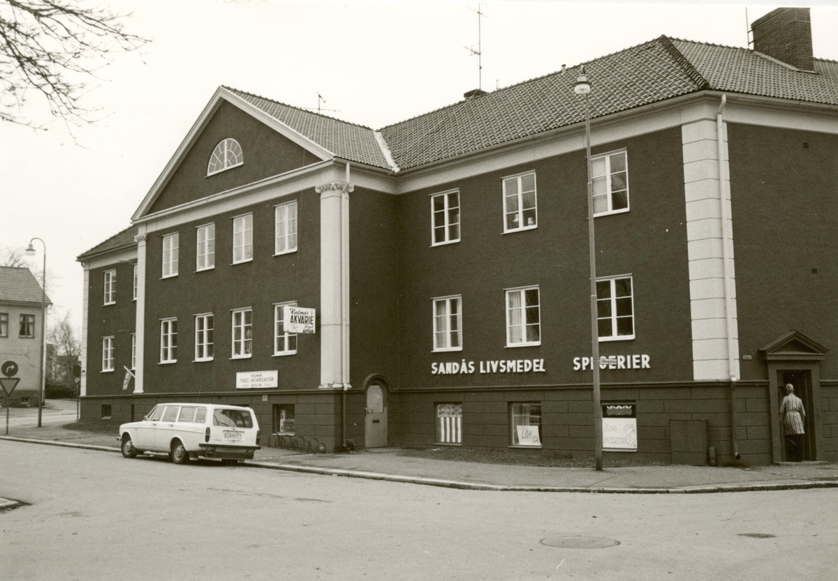 Kv Pilträdet 5, Sandåsgatan. Huvudfasad mot Sandåsgatan, som bildar en öppen plats i korsningen med Pilgatan.