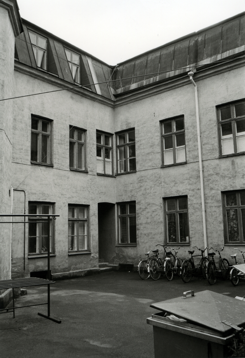 Bakgårdsmiljö på Kaggensgatan i Kalmar. Innergården, sedd mot husets vinkel. I vinkeln ligger ett portvalv. Längs fasaden, framför portvalvet, står cyklar parkerade och närmast i bild, till vänster, ser man en piskställning för mattor och till höger står soptunnor.