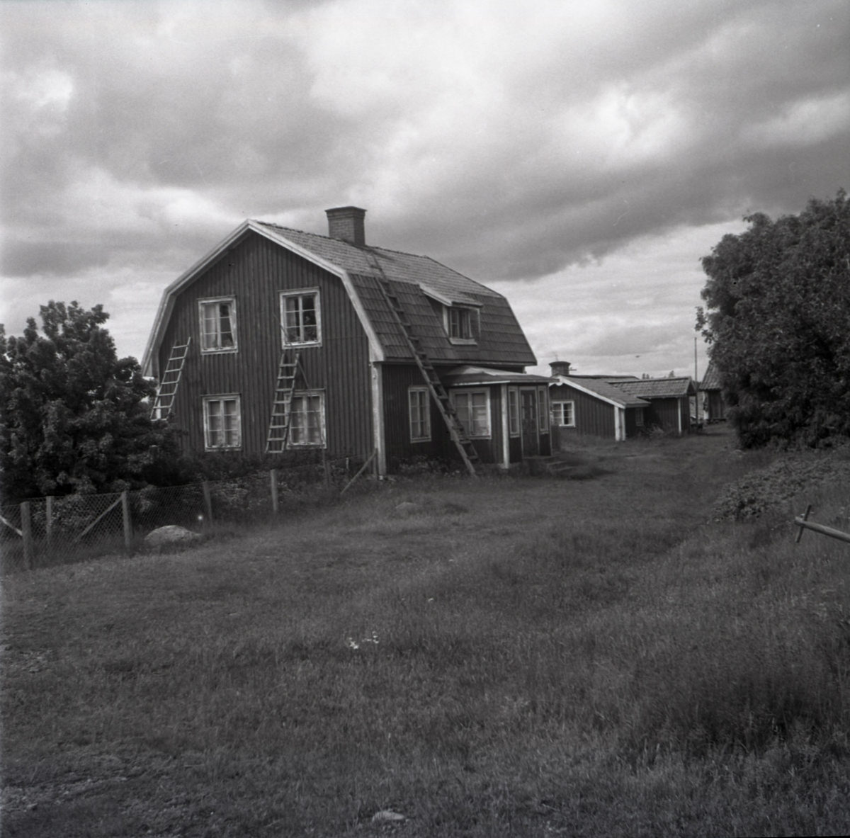 Ett bostadshus med mansardtak, träfasad, stegar och veranda.