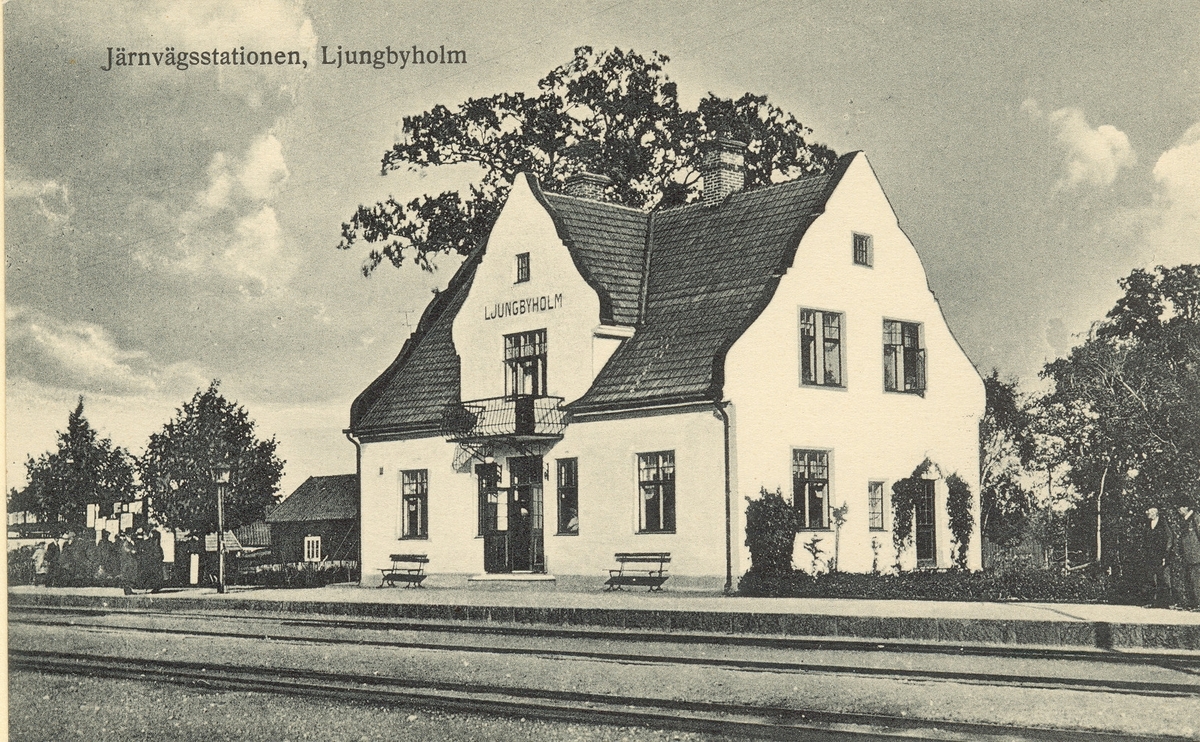 Vykort med motiv från järnvägsstationen i Ljungbyholm.