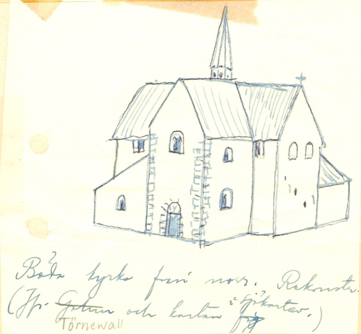 Teckning som visar en rekonstruktion av norra fasaden på Böda gamla kyrka.