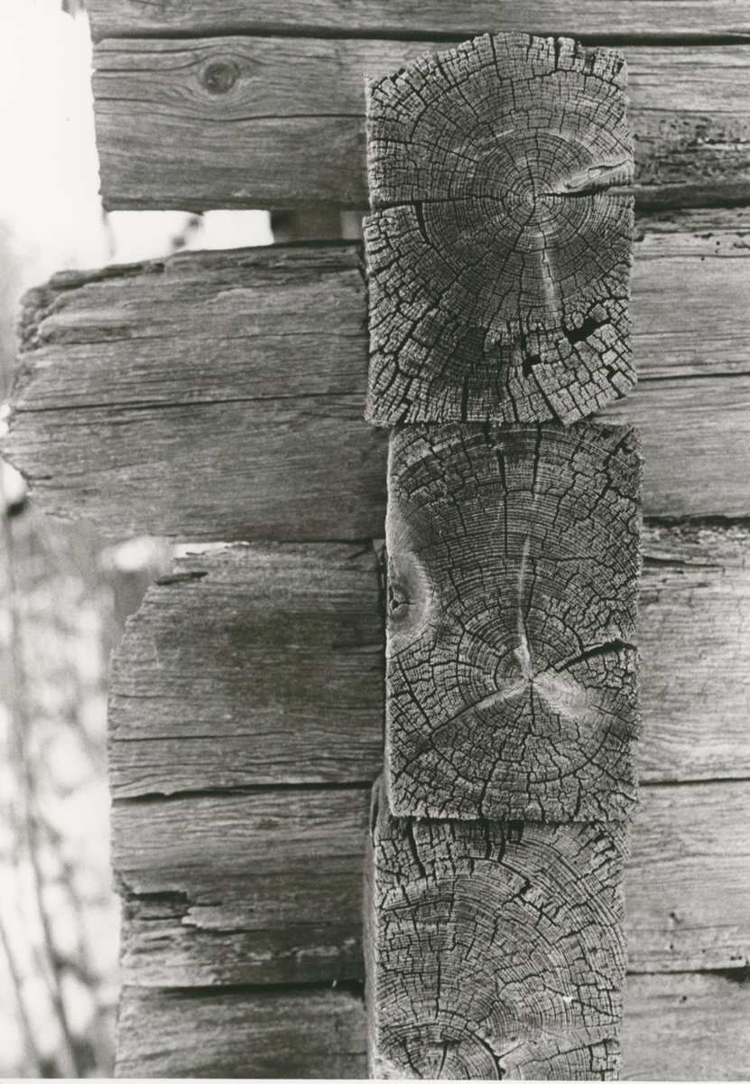 Detalj av en stuga med liggtimmer och korsknut.