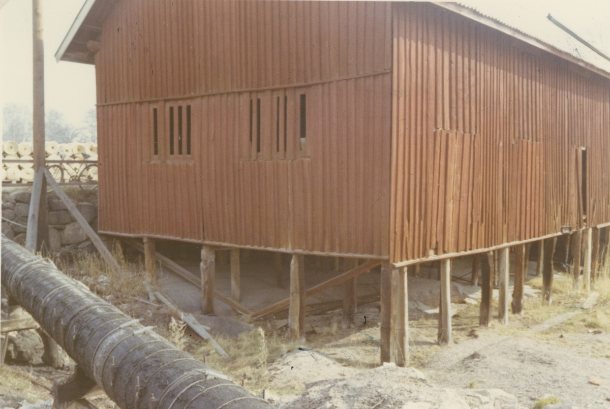 Magasin på Emsfors bruks område. Observera pappersrullarna i bakgrunden - bilden är tagen före 1989 när bruket lade ner.