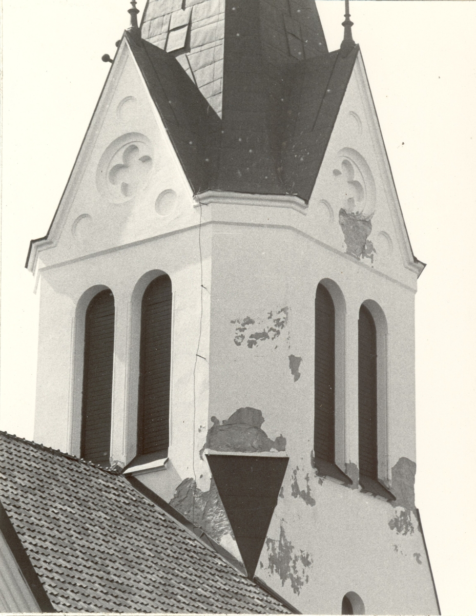 Tornet på Fågelfors kyrka har omfattande putsskador till följd av felaktig putsnings- och målningsteknik.