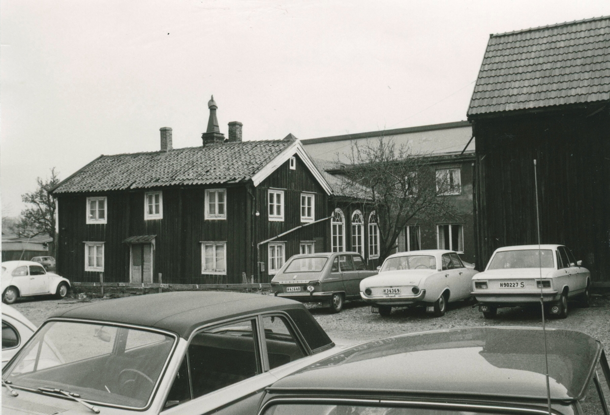Kvarter Mästaren 8, gårdsinteriör. Bilar på en parkering. Fiskaregatan till vänster.