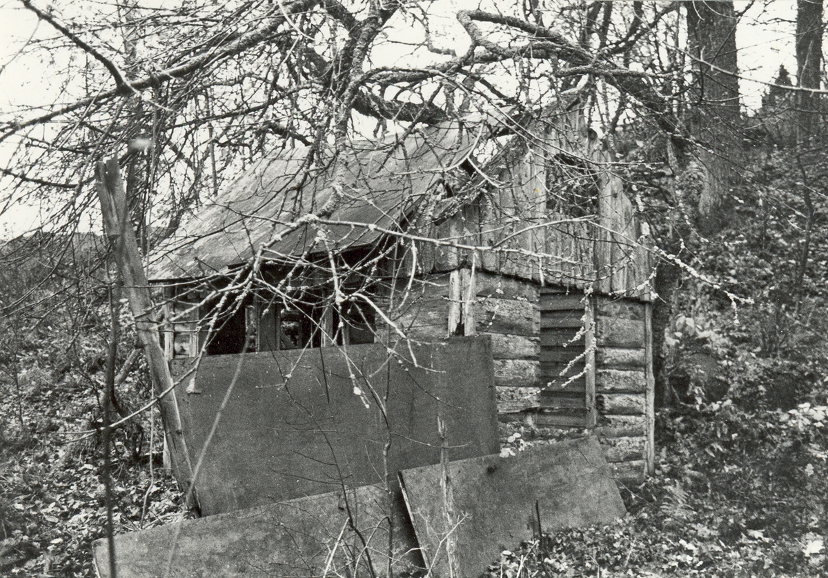 Lekstuga belägen i skogsbacke. Lekstugan har fasad av liggande timmer.