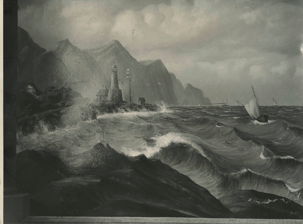 Harbergska gården, detalj av målning på väggen målad 1886, signerad A. Roth. Axel Roth var en kringresande målare, verksam bland annat i pataholmstrakten, med naiva beställningsbilder av bond- och herrgårdar.