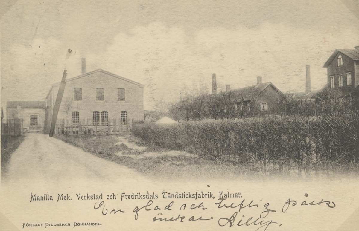 Titel: Manilla Mekaniska verkstad och Fredriksdals Tändsticksfabrik, Kalmar. En glad och treflig påsk önskar Lilly.