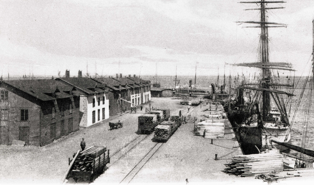 Gammal bild på hamnplanen i Kalmar med magasin och segelfartyg.
