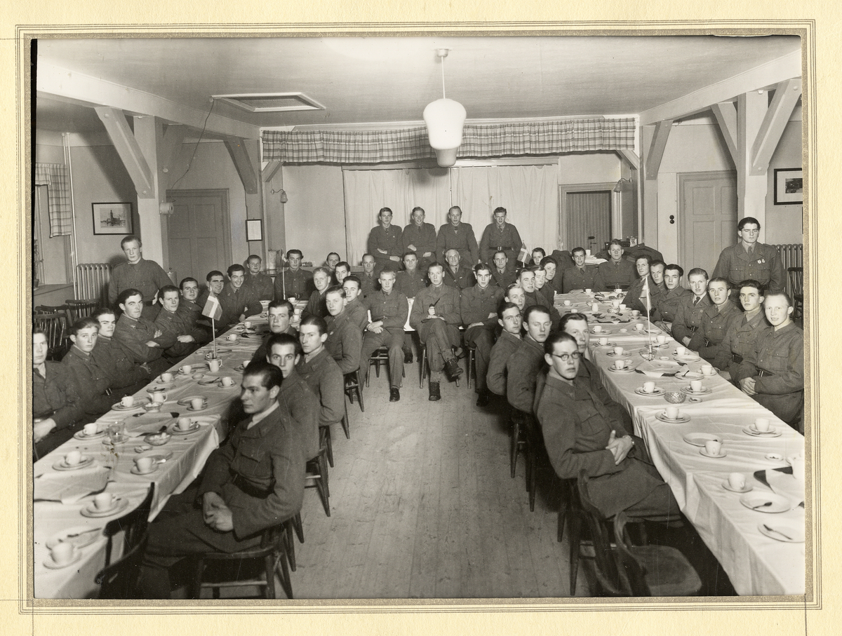 Kaffe på I 11, 1940-tal. Ett antal meniga har slagit sig ner runt borden.