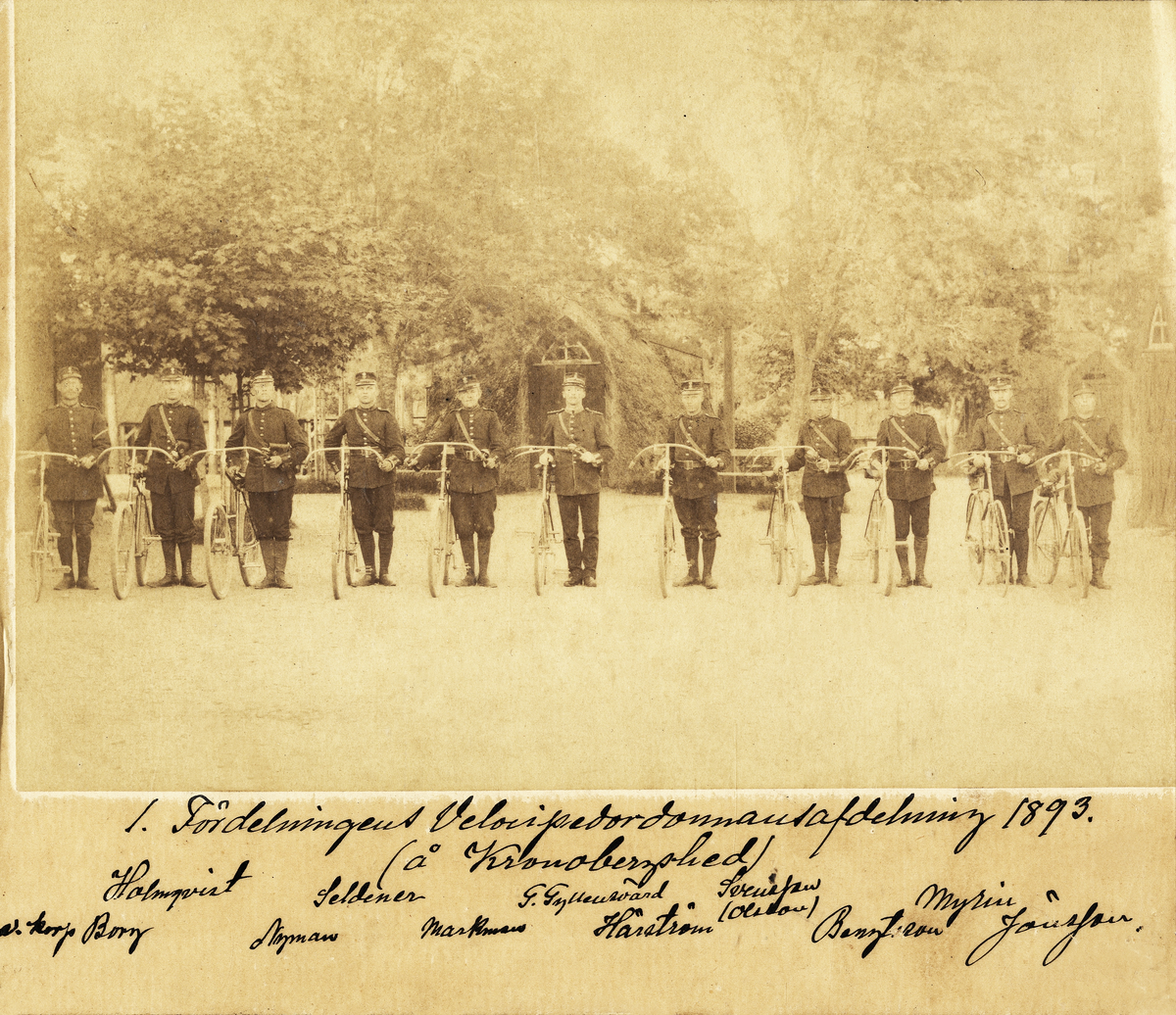 Text under bilden: "1. Fördelningens Velocipedordonnansafdelning 1893 (å Kronobergshed).