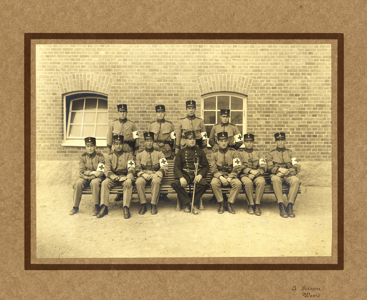 Sjukvårdsunderofficeren, sergeant J A Georg Andersson med värnpliktiga sjukvårdare (sjukbärare) utanför