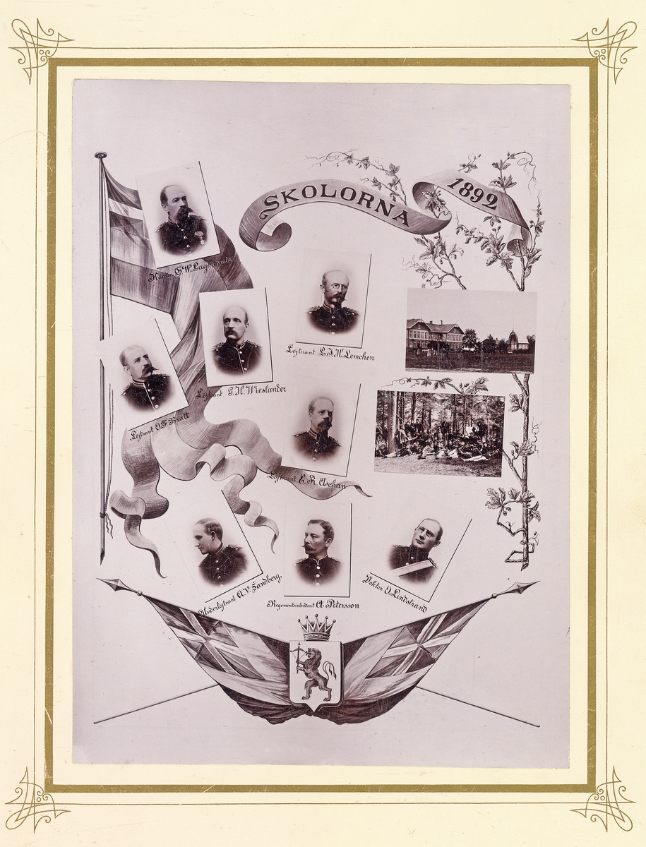 "Skolorna 1892". Ett collage av foton föreställande dels byggnader på Kronobergshed, dels några av de ansvariga officerarna vid Kronobergs regemente. Längst ner kan man också se Smålands vapen.