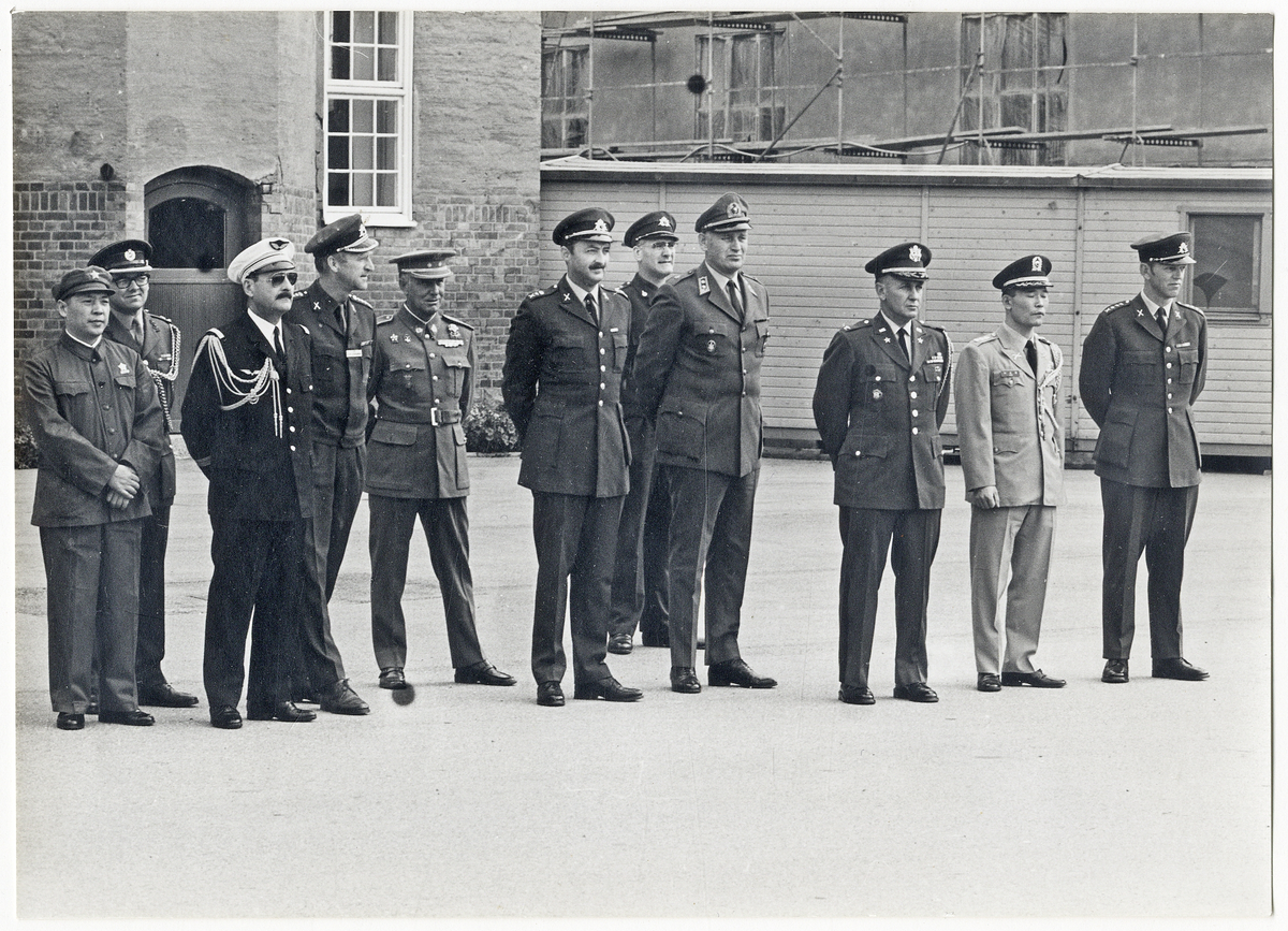 Fr.v.: "defence attaché" Wang, Folkrep. Kina, överstelöjtnant Raschen, Storbritannien, överste Grandperret, Frankrike, regchef I11 överste Lennart Löfgren, överstelöjtnant Hevia, Spanien, major Igelstam, FKE, kapten Hegg 111, överstelöjtnant Nordgren, Finland, överste Johnson, USA, överste Lee, Sydkorea samt kapten Tamm, FKE.