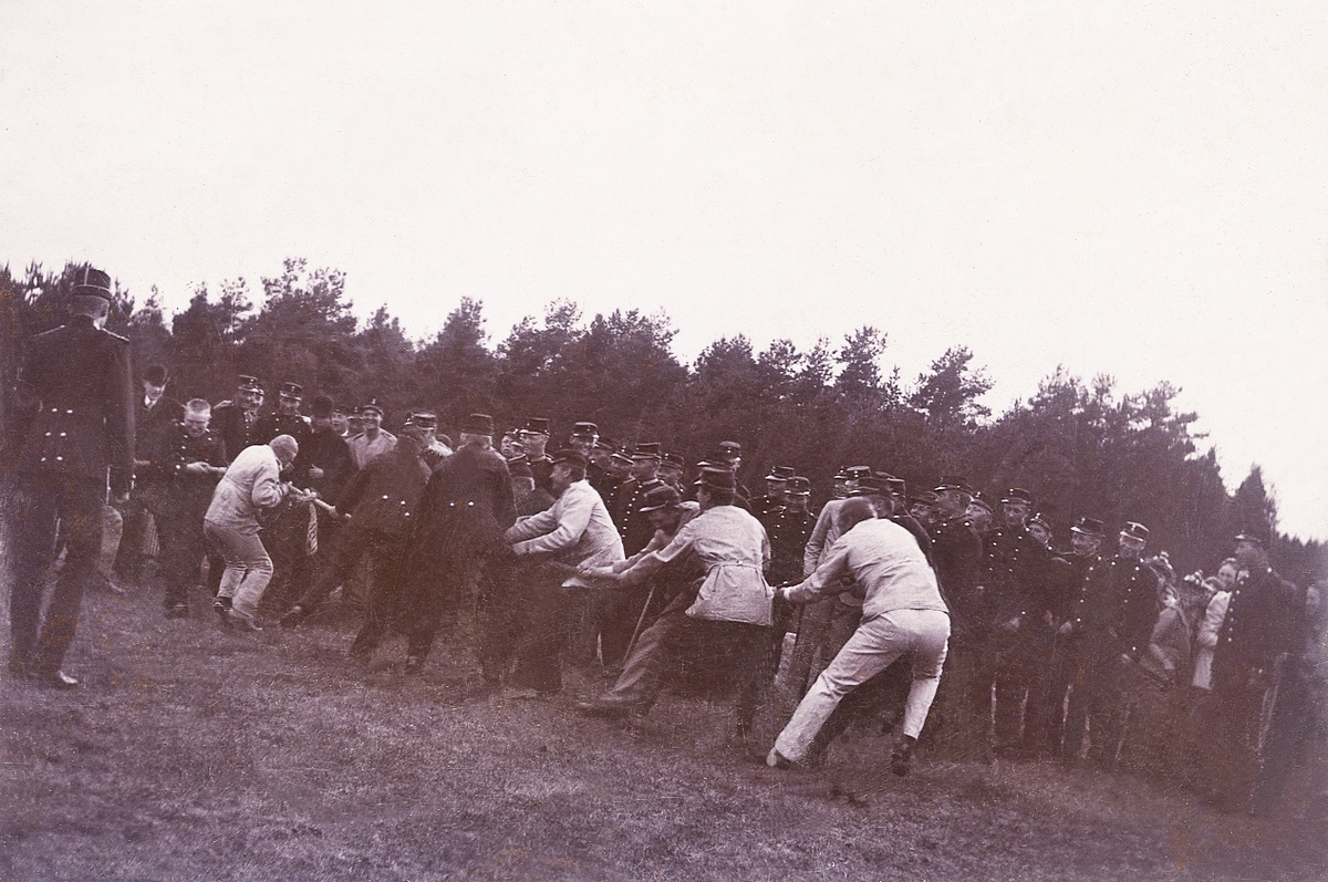 Dragkamp på Kronobergshed. Deltagarna är ivrigt påhejade av kamrater och övrig publik.