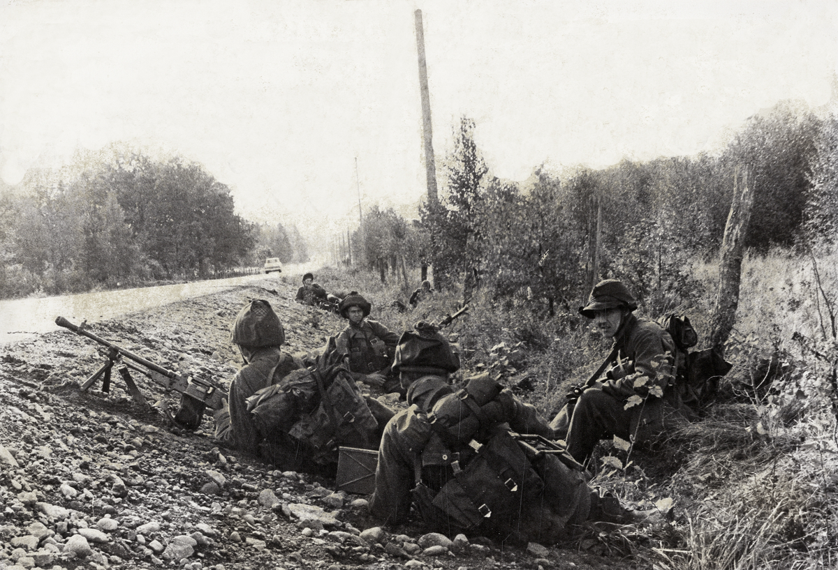 Kompaniövning, skkomp. Kspgrupp i "eldställning" vid en väg.