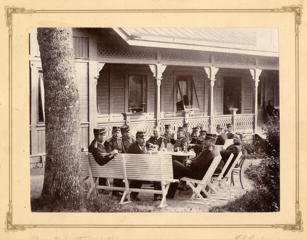 En grupp officerare har tagit en kaffepaus m.m. i eftermiddagshettan utanför en officersmäss.
