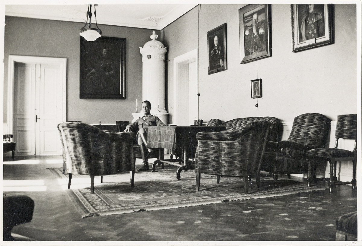 En okänd officer sitter i en fåtölj på officersmässen (I 11?).