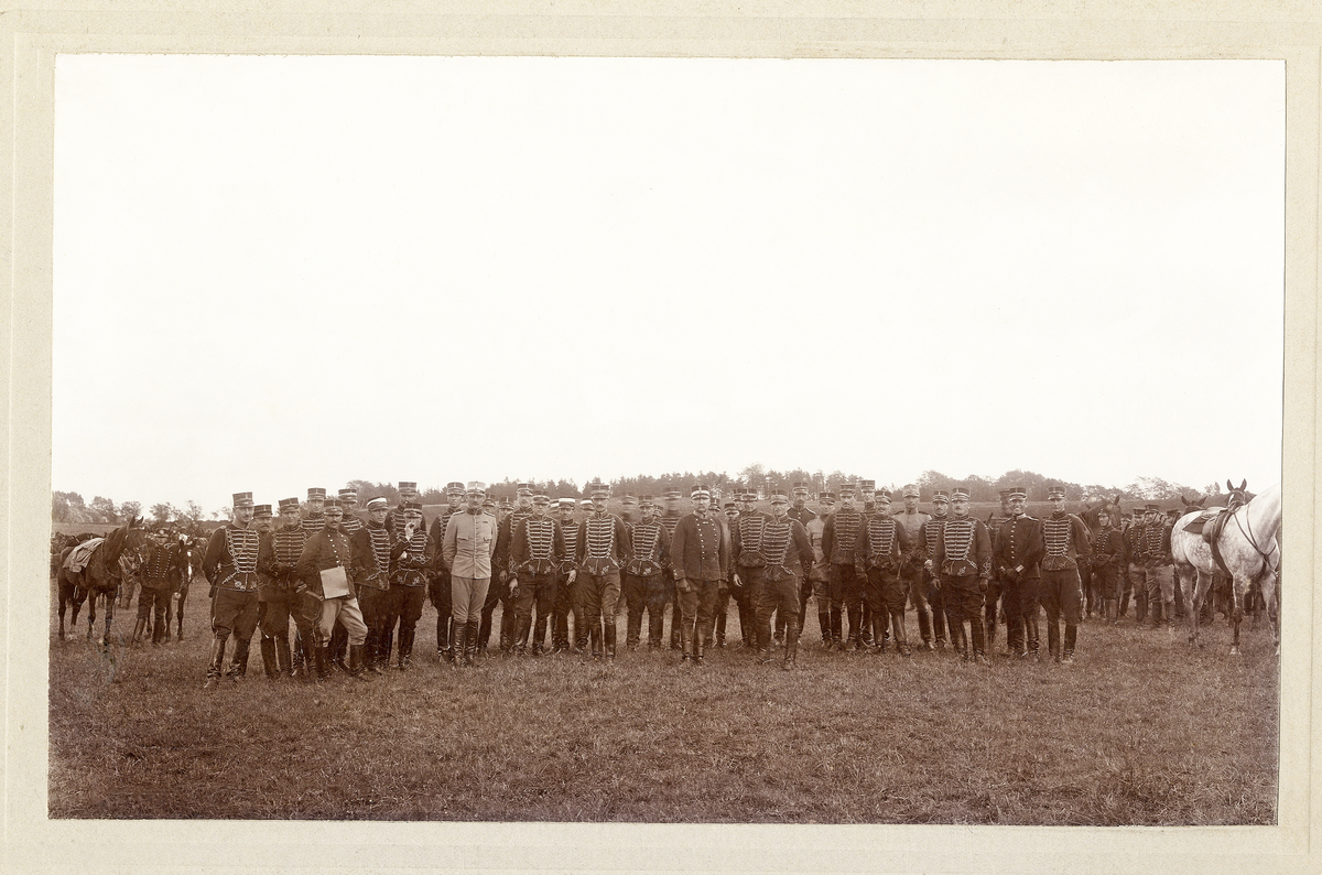 På sidorna syns några meniga med officerarnas (?) hästar.