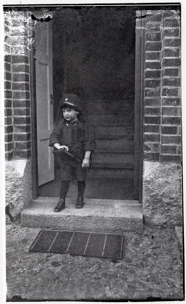 En liten pojke i 4-5-årsåldern i dörröppningen till ett hus på regementsområdet, (trol.) I11.
