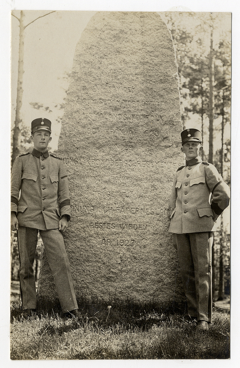 Två korpraler (Gustafsson och Palm) står vid minnesstenen (till minne över stupade soldater under 1600- och 1700-talet) i regementsparken, I11, 1923.