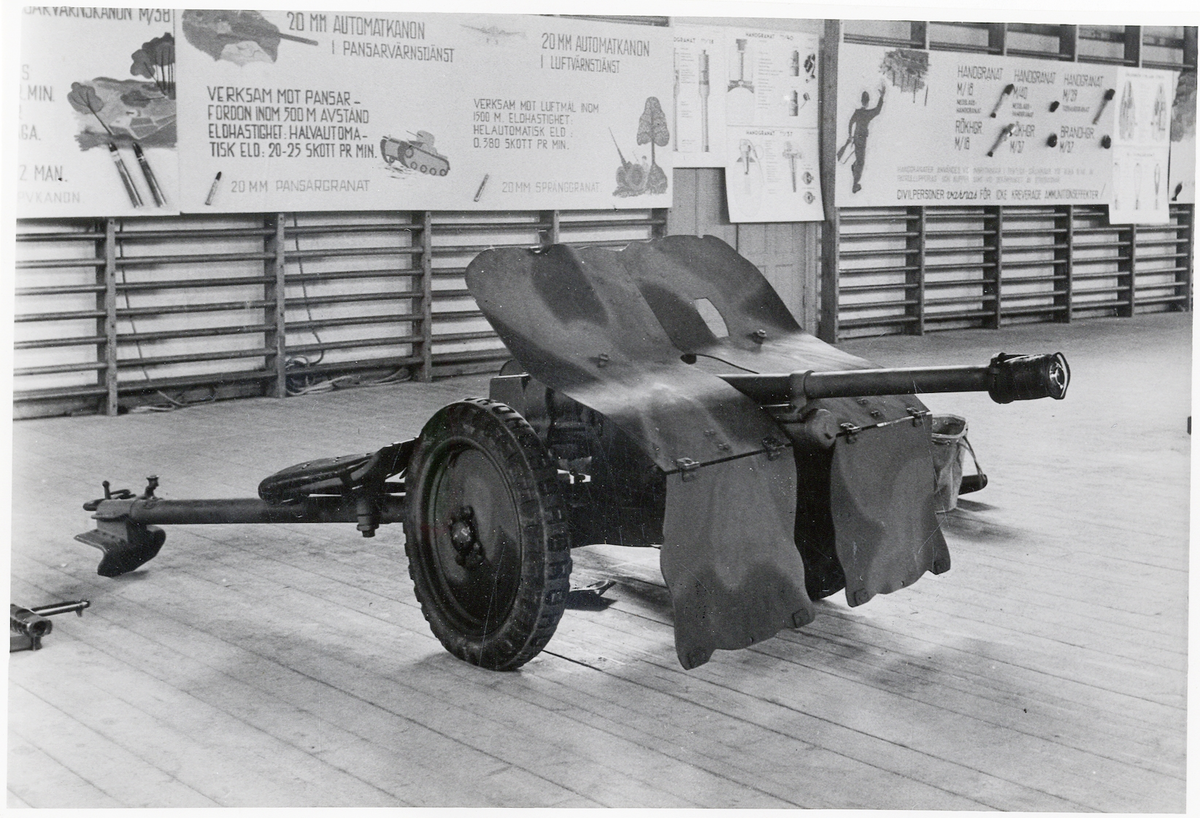 En pansarvärnskanon, kaliber 37 mm, m/38, står utställd på golvet.