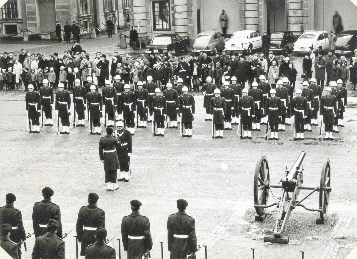 Högvakt, Stockholms slott, yttre borggården, 1968-03. BSI.