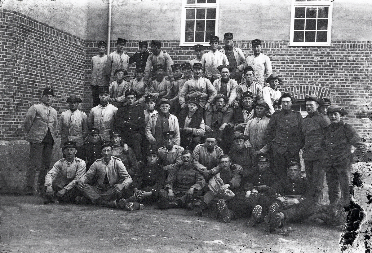 En grupp mannar i (mestadels) m/10 utanför en kasern.