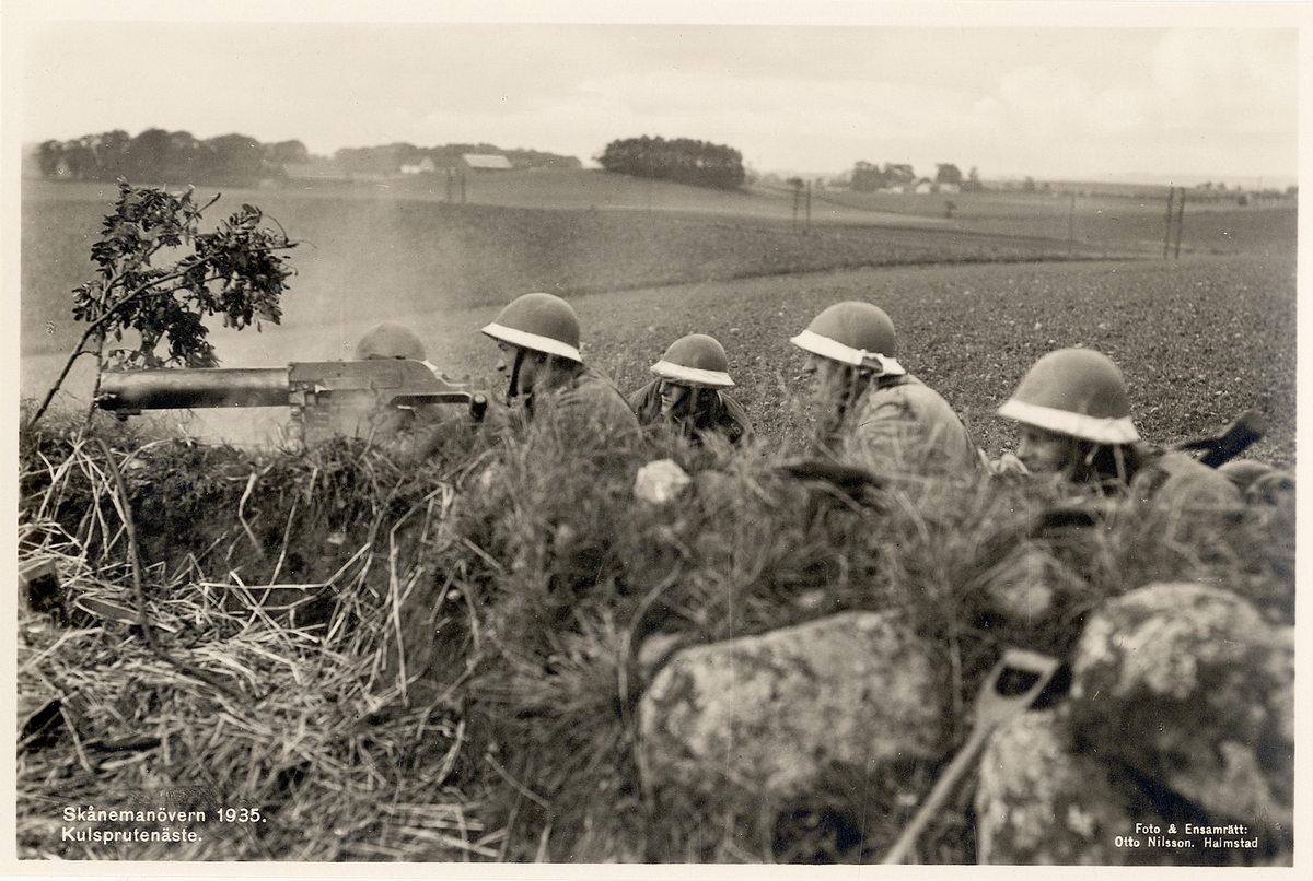 Ett kulsprutenäste med fyra man bakom en mindre vall ute i det skånska åkerlandskapet.