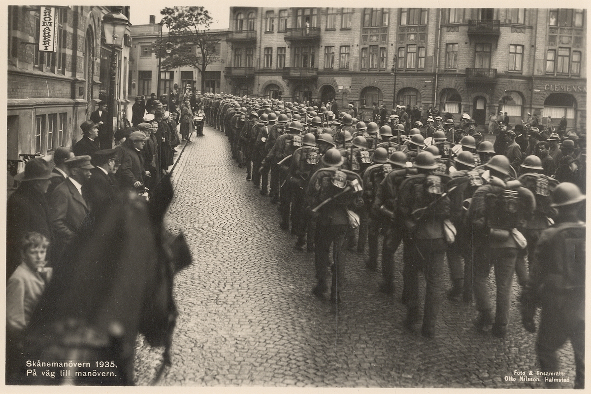 På väg till manövern. Ett regemente på marsch förbi Clemenstorget i Lund, beskådade av allmänheten.