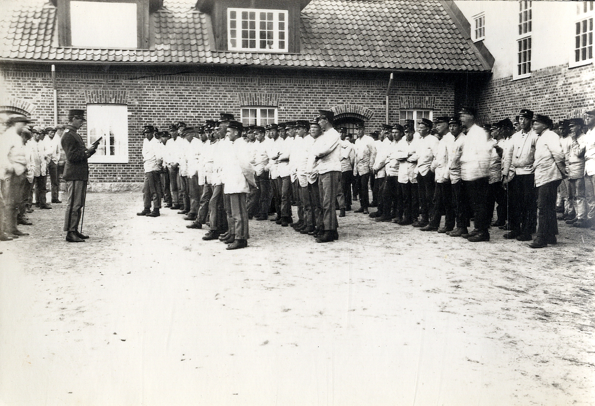 Kompaniet (6:e?) har genomgång i grötrockar på kaserngården.