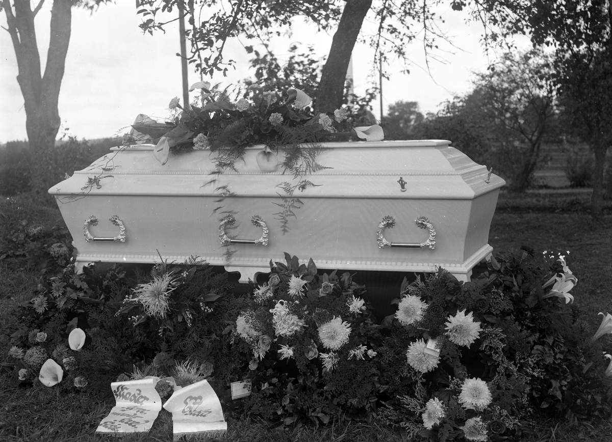Foto av en vitmålad kista utomhus, med mängder av blommor.