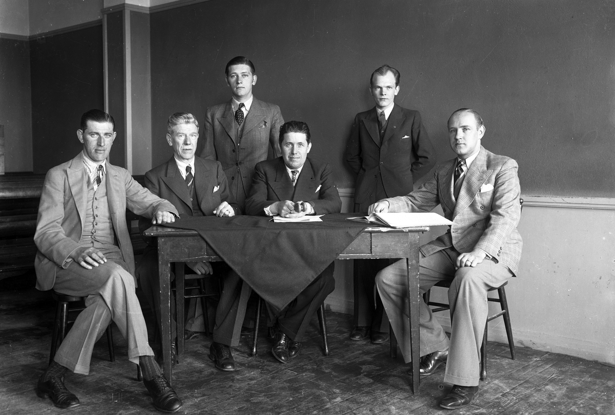Foto av sex män i kostym som grupperat sig kring ett bord.