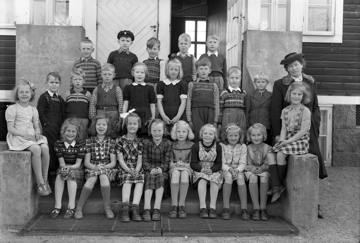 Foto av en skolklass med lärarinna, som samlats på skolans yttertrappa.