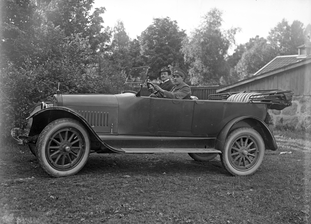 Foto av en nyss parkerad (?) bil med privatchaufför och passagerare.