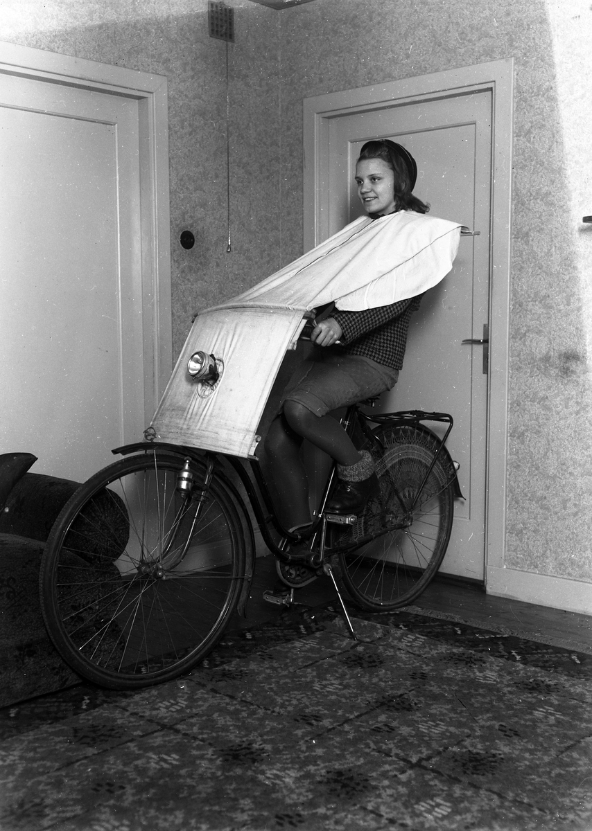 Foto av kvinna på cykel, med regnskydd.