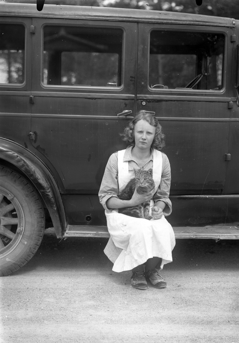 Foto av en kvinna som sitter vid en bil med en katt.