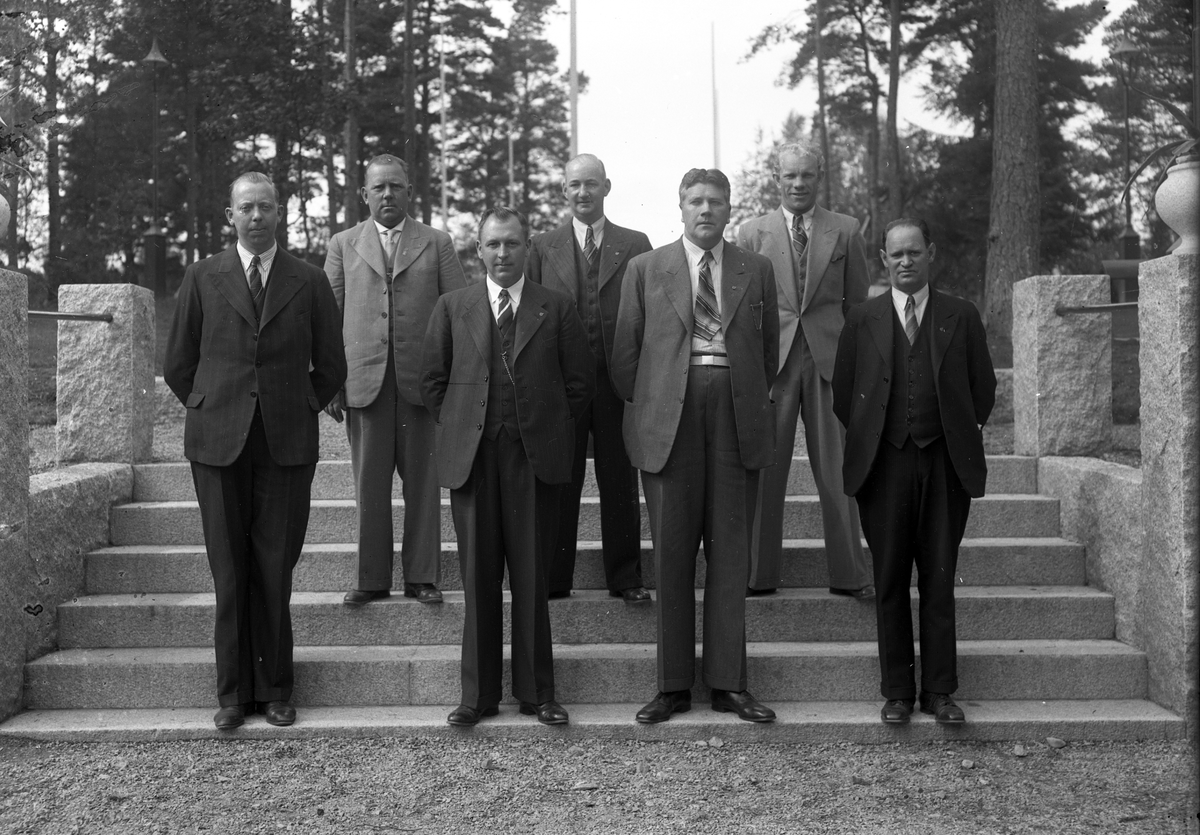 Foto av sju män i kostym som står på en trappa.