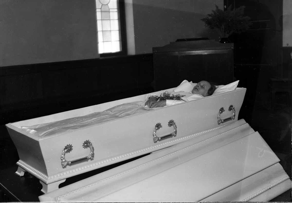 Foto av en död kvinna som ligger i en vitmålad kista i ett kapell.