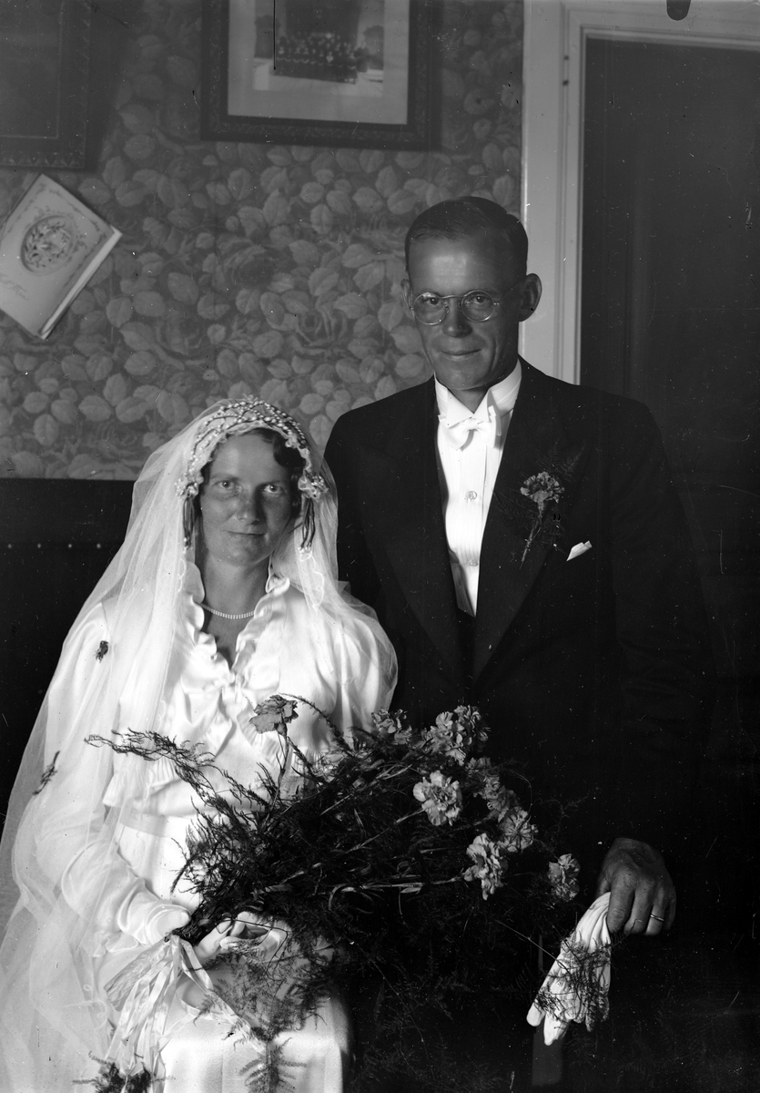 Foto av ett brudpar i ett vardagsrum. Hon är klädd i vit brudklänning med slöja och pärldiadem. Han bär frack.