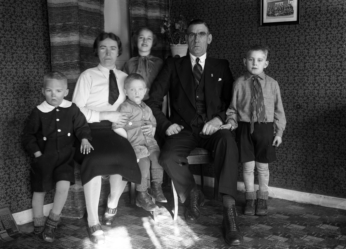 Gruppfoto av en familj med fyra barn i ett vardagsrum.