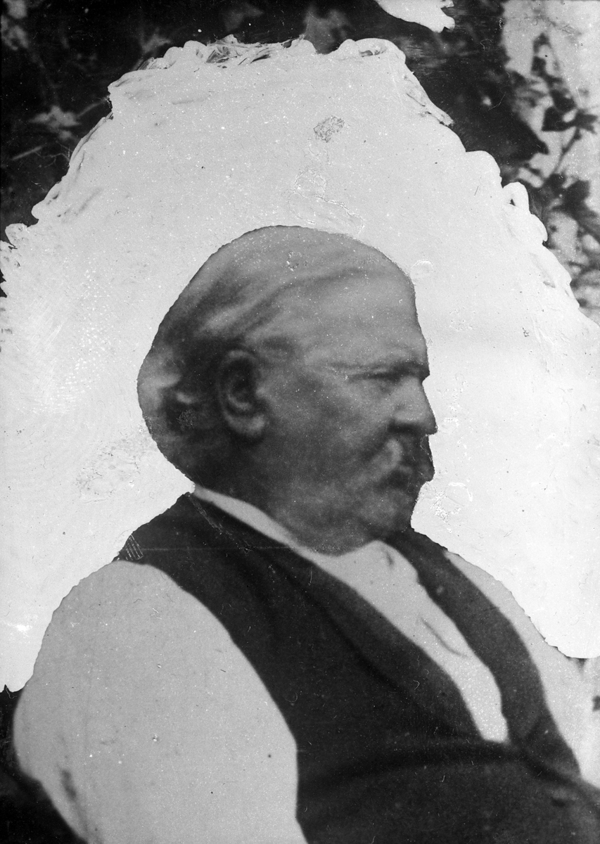 "Urklippt" foto av en äldre man i profil, iklädd skjorta och väst.